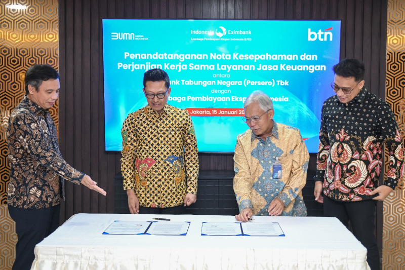 Direktur Utama BTN Nixon LP Napitupulu bersama Plt Direktur Pelaksana Pengembangan Bisnis LPEI Maqin U Norhadi, Direktur Distribution & Institutional Funding BTN Jasmin, Plt Direktur Pelaksana Keuangan, Operasional, & Teknologi Informasi LPEI Anwar Harsono dan Direktur Finance BTN Nofry Rony Poetra saat penandatanganan Nota Kesepahaman dan Perjanjian Kerja Sama Layanan Jasa Keuangan antara BTN dengan Lembaga Pembiayaan Ekspor Indonesia (LPEI) di Jakarta, Rabu (15/1).